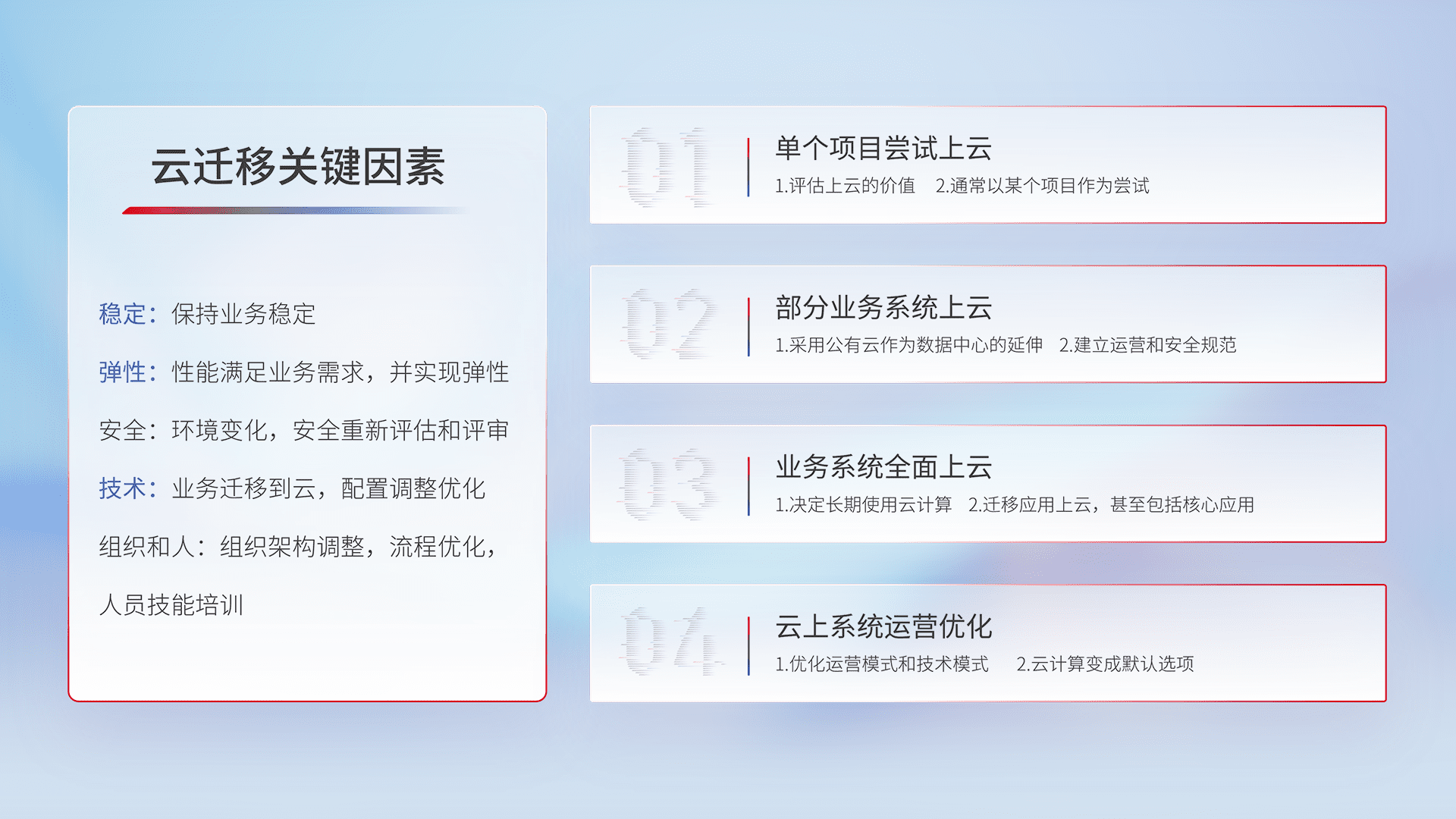 结合实际业务,,,从规划设计、、、云平台选型、、、、云原生改造、、、数据迁移、、、集成交付,,,迁移全过程为客户识别最佳上云路径,,,,做好风险识别管理,,,,设计网络架构、、身份权限、、、、安全审计合规、、、、操作审计、、日志审计、、监控告警策略、、多站点容灾设计等,,,对云上基础设施进行整体规划,,提升IT治理水平,,以满足弹性、、、高可用、、、高性能的需求。。。。